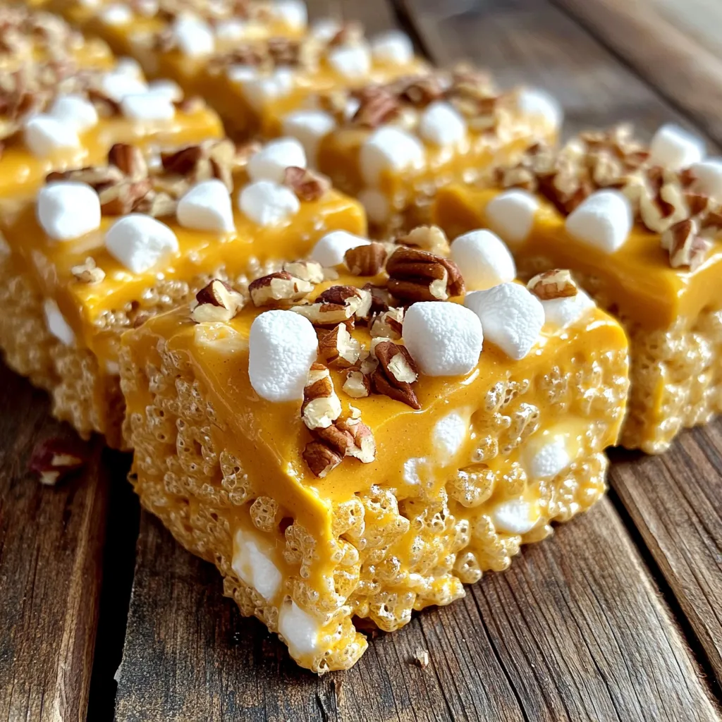 The key to great Pumpkin Spice Rice Krispie Treats is having all the right ingredients. Here’s what you need: - 4 cups Rice Krispies cereal - 1 cup mini marshmallows - 1/2 cup unsalted butter - 1/2 cup pumpkin puree - 1 teaspoon pumpkin pie spice - 1/2 teaspoon vanilla extract - 1/4 teaspoon salt - 1/2 cup white chocolate chips (optional) - 1/4 cup chopped pecans (for garnish, optional) Each ingredient adds a special touch. The Rice Krispies give a nice crunch. The mini marshmallows provide sweetness and stickiness. Butter adds richness, while pumpkin puree offers a smooth texture and fall flavor. Pumpkin pie spice brings warmth and spice notes, making each bite cozy. Vanilla extract enhances the overall taste and salt balances the sweetness. White chocolate chips add a creamy layer, while pecans offer a delightful crunch when used as a garnish. These ingredients blend perfectly to create a comforting and tasty treat, perfect for fall snacking. Start by greasing a 9x13 inch baking dish with butter. You can also line it with parchment paper. This step helps the treats come out easily after cooling. In a large pot, melt 1/2 cup of unsalted butter over medium heat. Once the butter is melted, add 1 cup of mini marshmallows. Stir constantly until the marshmallows melt and become smooth. This may take a few minutes. Next, stir in 1/2 cup of pumpkin puree, 1 teaspoon of pumpkin pie spice, 1/2 teaspoon of vanilla extract, and 1/4 teaspoon of salt. Mix these ingredients well. After that, remove the pot from the heat. Gently fold in 4 cups of Rice Krispies cereal. If you want, add 1/2 cup of white chocolate chips as you mix. Pour the mixture into your prepared baking dish. Use a spatula or your hands to press it down firmly. This helps create an even texture. Let the treats cool at room temperature for about 30 minutes before cutting them into squares. Enjoy your tasty fall snack! To get the best texture in your treats, press down firmly. This helps them stick together. If you don’t press hard enough, they will fall apart. After you press the mixture, let it cool for about 30 minutes. This cooling time makes cutting them easier. If you cut them too early, they may squish. You can make these treats even better by adding white chocolate chips. They add a sweet and creamy taste. You can also mix in nuts like pecans for crunch. Topping the treats with chopped pecans gives a nice look too. Feel free to get creative with other toppings that you love. Having the right tools makes cooking easier. Use a large pot for melting butter and marshmallows. A sturdy spatula helps you mix and press the ingredients. A 9x13 inch baking dish is best for this recipe. If you line it with parchment paper, your treats will come out easily. {{image_2}} If you want a gluten-free treat, swap Rice Krispies for gluten-free cereals. Brands like Crispy Rice work well. They give you that same crunch and sweetness. Just check the label to be sure. You can change the flavor by adding spices or extracts. For a twist, try adding cinnamon or nutmeg. A splash of maple extract adds a fall touch too. Mix and match to find your favorite! To make these treats vegan, use dairy-free butter and marshmallows. There are many good brands today that offer vegan options. This way, everyone can enjoy this tasty snack without worry. To keep your Pumpkin Spice Rice Krispie Treats fresh, store them in an airtight container. This helps to keep moisture out and keeps them soft. You may also wrap the treats in plastic wrap before placing them in the container. This extra layer adds protection and keeps them from drying out. At room temperature, these treats last about 3 days. If you place them in the fridge, they can stay fresh for up to a week. Just make sure to seal them well. The cold can make them firmer, but they will still taste great. You can freeze these treats for longer storage. First, cut them into squares. Then, wrap each square in plastic wrap. Place the wrapped treats in a freezer-safe bag or container. They can last up to 2 months in the freezer. To thaw, simply leave them at room temperature for a few hours. Enjoy them as a tasty treat anytime! Pumpkin Spice Rice Krispie Treats stay fresh for about a week. Store them in an airtight container at room temperature. This keeps them soft and tasty. If you want to keep them longer, you can refrigerate them. Just make sure to wrap them well. They can last up to two weeks in the fridge. Always check for any signs of spoilage before eating. Yes, you can! If you want a twist, try using Cornflakes or Cheerios. These cereals will still give you that crunchy texture. You can even use gluten-free cereals if you need them. Just remember to adjust the amount of marshmallows if the cereal is bigger or smaller. To reduce stickiness, make sure to grease your hands and the bowl with butter. This helps keep the mix from sticking. You can also add a little more cereal to the mix. This balances the sticky marshmallow and makes it easier to handle. Mixing quickly helps too, so you don’t let the marshmallows cool down too much. This blog post shared a simple recipe for Pumpkin Spice Rice Krispie Treats. You learned about essential ingredients, step-by-step instructions, and handy tips. From achieving the perfect texture to creative variations, you now have the tools to make these treats. Remember to store them well to keep them fresh. Experimenting with flavors can make your treats even better. Enjoy making this fun fall favorite and share your results with friends!