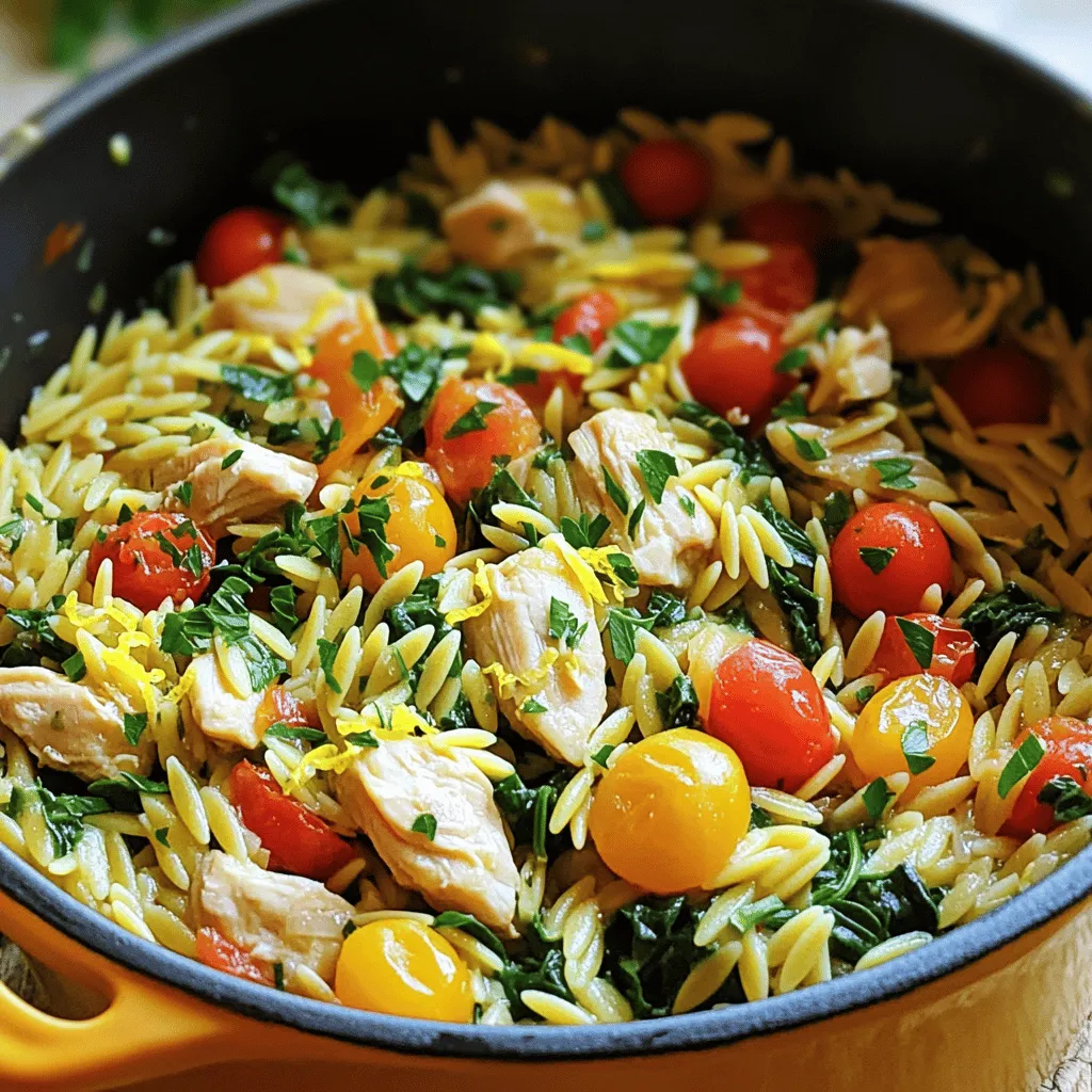 ![- 2 boneless, skinless chicken breasts, diced - 1 cup orzo pasta - 4 cups chicken broth - 1 lemon (zest and juice) - 1 cup baby spinach, roughly chopped - 1 cup cherry tomatoes, halved - 2 cloves garlic, minced - 1 medium onion, finely chopped - 2 tablespoons olive oil - 1 teaspoon dried thyme - 1 teaspoon dried oregano - Salt and pepper to taste - Fresh parsley, chopped for garnish You will need a large pot or Dutch oven for this dish. A wooden spoon helps to stir the ingredients well. A knife and cutting board are great for chopping the chicken, onions, and tomatoes. You may also want measuring cups and spoons to ensure correct amounts of each ingredient. A zester will help you get the lemon zest easily. Choosing fresh chicken is key. Look for bright pink meat with no spots. When picking orzo, check for whole grains; it adds more fiber. Select firm cherry tomatoes with a deep color. Fresh spinach should be vibrant green with no wilting. For lemons, choose ones that are heavy for their size; they have more juice. Always use low-sodium chicken broth for better control over saltiness. Start by gathering your ingredients. You will need chicken, orzo, broth, lemon, spinach, tomatoes, garlic, onion, olive oil, thyme, oregano, salt, and pepper. 1. Heat the olive oil in a large pot over medium-high heat. 2. Add the chopped onion and cook for about 3 to 4 minutes. You want it to be soft and clear. 3. Now, add the minced garlic. Cook for another minute until it smells good. 4. Take the diced chicken and season it with salt, pepper, thyme, and oregano. 5. Add the chicken to the pot and cook it for 5 to 6 minutes. Make sure it turns brown on all sides. 6. Pour in the chicken broth and add the orzo. Stir well and bring it all to a boil. 7. Once it boils, lower the heat. Cover the pot and let it simmer for 10 to 12 minutes. Stir it every now and then to keep it from sticking. 8. When the orzo is done, add the lemon zest and juice, spinach, and cherry tomatoes. Stir everything together and cook for 2 to 3 more minutes. 9. Taste the dish. Add more salt, pepper, or lemon juice if needed. 10. Take the pot off the heat and let it sit for a couple of minutes. 11. Before serving, sprinkle fresh parsley on top. - Prep Time: 10 minutes - Cook Time: 30 minutes - Total Time: 40 minutes Check the chicken as it cooks. Ensure it’s brown all over. Keep an eye on the orzo. Stir it often to prevent sticking. The orzo should be tender but not mushy. Add the spinach and tomatoes at the right moment so they stay fresh and vibrant. To make One Pot Lemon Chicken Orzo shine, use fresh ingredients. Fresh lemon juice gives a bright taste. When cooking chicken, ensure it browns nicely. This adds depth to the flavor. Don't rush the simmering. It helps the orzo absorb the broth well. Stir occasionally to keep it from sticking. Finally, let it rest before serving. This allows flavors to meld beautifully. One common mistake is overcooking the orzo. This can make it mushy. Always check for doneness a minute or two early. Another mistake is neglecting seasoning. Taste as you cook and adjust salt and pepper. If you skip adding lemon zest, you miss out on a punch of flavor. Lastly, don’t add spinach too early. It should wilt without overcooking. To enhance flavors, add herbs like basil or dill. These fresh herbs boost the dish's aroma. You can also mix in some crushed red pepper for heat. A splash of white wine can add richness, too. If you like a creamier texture, stir in some grated Parmesan cheese before serving. For extra freshness, top with more lemon zest or herbs before enjoying. For the full recipe, refer to the detailed instructions above. Enjoy your cooking! {{image_2}} You can switch up the veggies in your one pot lemon chicken orzo. Try adding bell peppers for a sweet crunch. Zucchini slices can add a nice texture too. You might like peas for a pop of color and sweetness. Broccoli florets give a great green touch. You can mix and match your favorites. Just remember to keep the cooking time the same. This way, all your veggies cook evenly. If you want to change the protein, consider shrimp or turkey. Shrimp cooks fast and adds a lovely taste. Turkey is a lean option that works well too. You can also use cooked chicken. Just add it at the end to heat through. For a richer flavor, try using sausage. Slice it up and brown it with the onions. These swaps keep your dish exciting and new! Making this dish vegetarian is easy. Simply leave out the chicken and use vegetable broth. You can add more vegetables to fill the plate. Chickpeas can add protein and a creamy texture. Tofu is another great option for protein. Just cube it and sauté it with the onions. This way, you still get a hearty meal that everyone can enjoy. For the full recipe, check out the [Full Recipe]. Store your One Pot Lemon Chicken Orzo in an airtight container. This keeps it fresh. Let the dish cool down before sealing it. Place it in the fridge within two hours of cooking. It can last for up to three days. When you are ready to eat, check for any signs of spoilage first. You can freeze the orzo dish for longer storage. Use freezer-safe containers or bags. Divide the dish into single servings for easy meals later. Make sure to label each bag with the date. This helps you keep track of how long it has been frozen. It can last for about three months in the freezer. When reheating, it’s best to thaw it first. Place the frozen orzo in the fridge overnight. To reheat, use a microwave or stove. If using a microwave, cover the dish to trap moisture. Stir halfway through heating for even warmth. You can add a splash of chicken broth or water to keep it moist. This will enhance the taste and texture. Enjoy your meal just as fresh as the first time! You can serve this dish with a fresh salad. A simple green salad pairs well. Garlic bread is another tasty option. Consider adding a side of roasted veggies for extra flavor. You can prep the dish a day ahead. Cook e
