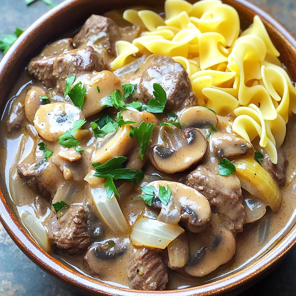 - 1.5 lbs beef stew meat, cut into bite-sized pieces - 1 medium onion, diced - 2 cloves garlic, minced - 2 cups beef broth - 1 cup sliced mushrooms (button or cremini) The main ingredients for beef stroganoff set the stage for a rich flavor. The beef stew meat is the star, offering a tender bite after slow cooking. Diced onion and minced garlic add depth, while beef broth creates a savory base. The mushrooms bring umami notes that enhance the dish beautifully. - 1 tablespoon Worcestershire sauce - 1 teaspoon Dijon mustard - 1 teaspoon paprika - Salt and pepper to taste Flavors and seasonings elevate the dish. Worcestershire sauce adds a tangy kick. Dijon mustard gives it a slight bite, while paprika lends warmth. Salt and pepper are key to balancing flavors. Adjust these to suit your taste. - 1 cup sour cream - 2 tablespoons all-purpose flour - 8 oz egg noodles - Fresh parsley, chopped (for garnish) The additional ingredients finish the dish. Sour cream adds creaminess, while flour helps thicken the sauce. Egg noodles are perfect for soaking up the sauce. Fresh parsley brings color and freshness, making your dish pop. - Dicing the onion and mincing the garlic Start by dicing the medium onion. Aim for small pieces for even cooking. Next, mince two cloves of garlic. This adds great flavor to the dish. - Preparing beef stew meat and mushrooms Cut 1.5 lbs of beef stew meat into bite-sized pieces. This helps the meat cook evenly. Slice 1 cup of mushrooms. You can use button or cremini mushrooms, depending on your taste. - Combining ingredients in the slow cooker In a large bowl, mix the beef, onion, garlic, mushrooms, 2 cups of beef broth, 1 tablespoon of Worcestershire sauce, 1 teaspoon of Dijon mustard, 1 teaspoon of paprika, and salt and pepper to taste. Pour this mixture into the slow cooker. - Setting cooking times for low and high settings Cover the slow cooker. Cook on low for 7-8 hours or on high for 4-5 hours. The beef should be tender when done. - Preparing egg noodles About 30 minutes before serving, cook 8 oz of egg noodles according to the package instructions. After cooking, drain the noodles and set them aside. - Incorporating sour cream and flour mixture In a small bowl, mix 1 cup of sour cream with 2 tablespoons of all-purpose flour until smooth. Stir this mixture into the slow cooker. Cook on high for an additional 30 minutes to thicken the sauce. - Garnishing and serving suggestions Once the sauce thickens, taste it and adjust the seasoning if needed. You can mix the cooked egg noodles into the stroganoff or serve them separately. Garnish with fresh chopped parsley before serving. Enjoy your creamy beef stroganoff! For the best flavor, I recommend using button or cremini mushrooms. Both add a rich, earthy taste to the dish. If you want to try something new, shiitake mushrooms also work well. Adjusting seasoning is key, too. After cooking, taste the stroganoff. If it lacks depth, add more salt or pepper. A splash of Worcestershire sauce can enhance the flavor even more. To check for tenderness, use a fork. If it breaks apart easily, the beef is ready. For slow cooking, always set the cooker on low. This allows the flavors to meld. Avoid opening the lid often. Each time you do, heat escapes. Let it cook undisturbed for the best results. Pair your stroganoff with a fresh salad or steamed veggies. A simple green salad adds a nice crunch. When serving egg noodles, you can mix them directly into the stroganoff. Alternatively, serve the noodles on the side. This keeps them from getting soggy. Garnish with chopped parsley for a bright finish. {{image_2}} You can switch up the meat in beef stroganoff. Try chicken or pork for a different touch. They will bring their own flavors to the dish. If you want a lighter meal, use lean cuts or even tempeh. For dairy-free options, swap sour cream with a plant-based yogurt. This keeps the creamy texture without the dairy. Adding herbs and spices can elevate your stroganoff. Consider using thyme or rosemary for a fragrant twist. You might also enjoy a pinch of cayenne for heat. For sauces, you can replace the sour cream with a rich gravy. Cream-based sauces like Alfredo can also add a new layer of taste. Experiment to find your favorite combination. Serve your beef stroganoff over mashed potatoes or rice for a filling meal. This adds a nice base that soaks up the sauce. You can also incorporate vegetables for a heartier dish. Carrots and peas can add color and nutrition. Mixing them in gives a balanced, delicious meal. To keep your beef stroganoff fresh, store it in an airtight container. Place it in the fridge within two hours after cooking. If you want to enjoy it later, allow it to cool first. This helps keep the texture nice. Use it within three to four days for the best taste. You can reheat your stroganoff in the microwave or on the stovetop. For the microwave, use a microwave-safe dish. Heat in short bursts, stirring often. This helps it heat evenly. If you choose the stovetop, use a small pan over low heat. Stir often to avoid burning. To keep egg noodles from getting soggy, heat them separately. Add a splash of water to them while reheating. This keeps them fluffy and delicious. To freeze portions safely, use freezer-safe containers. Make sure to leave some space at the top. This allows for expansion as it freezes. You can freeze beef stroganoff for up to three months. When it's time to eat, thaw it in the fridge overnight. For reheating, use the stovetop or microwave. Add a bit of broth to keep the sauce creamy. This ensures your meal tastes just as good as fresh. Yes, you can cook this beef stroganoff on the stove or in the oven. For the stove, brown the beef in a large pan first. Then add the onion and garlic. Cook them until soft. Next, stir in the beef broth, mushrooms, Worcestershire sauce, mustard, paprika, salt, and pepper. Bring this mix to a boil. Then lower the heat, cover, and let it simmer for about an hour. For the oven, f