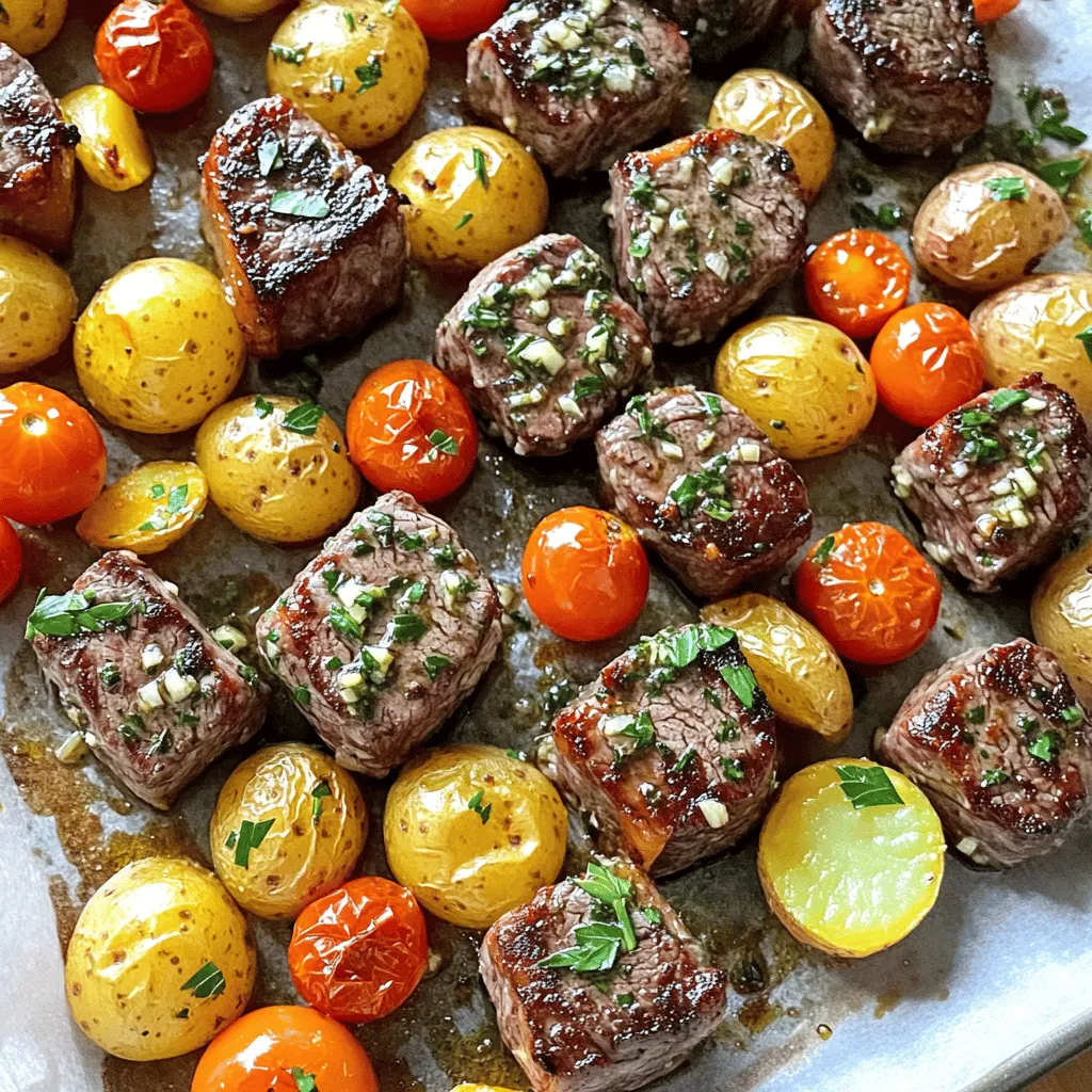 - 1.5 pounds sirloin steak, cut into bite-sized cubes - 4 tablespoons unsalted butter, divided - 4 cloves garlic, minced - Fresh rosemary and thyme (or dried alternatives) - Smoked paprika - Salt and black pepper - 1 pound baby potatoes, halved - 1 cup cherry tomatoes - Fresh parsley, chopped (for garnish) The main ingredients for garlic butter steak bites include sirloin steak, butter, and garlic. I prefer sirloin for its tender texture and rich flavor. The unsalted butter adds a creamy base to the dish. Fresh garlic elevates the taste with its savory aroma. For herbs and spices, I use fresh rosemary and thyme. These herbs give a fragrant touch to the dish. Smoked paprika adds a hint of warmth and color. Salt and black pepper enhance all the flavors. Adjust the amounts to match your taste. For accompaniments, I choose baby potatoes and cherry tomatoes. The potatoes provide a hearty base, while the tomatoes add freshness. Garnishing with parsley brightens the dish and adds color. Enjoy mixing these tasty ingredients for a delightful meal! - Preheat your oven to 400°F (200°C). - Line a large sheet pan with parchment paper. This makes cleanup easy. - Melt 2 tablespoons of unsalted butter. You can use the microwave or stovetop. - Mix the melted butter with 4 cloves of minced garlic, 1 tablespoon of chopped rosemary, and 1 tablespoon of chopped thyme. - Add 1 teaspoon of smoked paprika, plus salt and pepper to taste. This mix brings out great flavors. - Toss 1.5 pounds of cubed sirloin steak with half of the garlic herb mixture. Make sure each piece is well coated. - In another bowl, take the remaining herb mixture and toss it with 1 pound of halved baby potatoes. This adds flavor to the potatoes. - Spread the seasoned potatoes in a single layer on one side of the sheet pan. Roast them for 15 minutes. - After 15 minutes, take the pan out and add the steak bites and 1 cup of cherry tomatoes on top. - Cut the remaining 2 tablespoons of butter into small pieces. Dot this butter over the steak and tomatoes. - Put the pan back in the oven and roast for an additional 10-12 minutes. Check for your desired doneness. For medium-rare, aim for 130°F (54°C). To get your steak just right, know the target temperatures: - Medium-rare: about 130°F (54°C) - Medium: around 140°F (60°C) - Well-done: about 160°F (71°C) Use a meat thermometer to check. After baking, let your steak rest for a few minutes. This step makes it juicy. The juices spread back through the meat, giving you a tender bite. You can add a twist to your garlic butter steak bites. Here are some ideas: - Try adding fresh oregano or parsley for a different taste. - A pinch of cayenne pepper gives a nice kick. - Different cuts of steak work, too! Ribeye adds more fat for flavor, while filet mignon is very tender. Experiment with what you have. Each change can surprise you with new tastes. For a great look, serve your steak bites family-style right from the sheet pan. It feels warm and inviting. Just sprinkle some fresh parsley on top for color. For individual plates, scoop some steak, potatoes, and tomatoes into each dish. Drizzle leftover garlic butter over everything. This adds shine and flavor. A good presentation makes your meal even more enjoyable. {{image_2}} You can add more veggies to your sheet pan meal. Bell peppers are colorful and sweet. Zucchini adds a nice crunch. Asparagus brings earthiness. Just cut them into bite-sized pieces like the potatoes. Toss them with the garlic herb mix before roasting. This way, you get a tasty mix of flavors and colors. If you want a change, try chicken or shrimp. For chicken, use boneless thighs or breasts. Cut them into cubes like steak. Cook chicken for about 20-25 minutes. Shrimp cooks faster. Add shrimp to the pan for the last 5-7 minutes. This keeps them tender and juicy. For a meat-free option, replace steak with plant-based protein. Use hearty veggies like mushrooms or eggplant. They soak up flavors from the garlic butter well. You can also try chickpeas for added protein. Toss them in the garlic mix and roast until they are golden. This gives you a satisfying, plant-based dish. To keep your Sheet Pan Garlic Butter Steak Bites fresh, place them in an airtight container. Ensure the dish cools to room temperature before sealing it. Store the container in the fridge for up to three days. This will help retain the flavors and keep the steak bites tender. If you want to enjoy them later, proper storage is key. You can reheat your steak bites using several methods. The microwave is quick and easy. Place the steak bites in a microwave-safe dish and cover them. Heat for about 1-2 minutes, checking every 30 seconds. For a better texture, use the oven. Preheat the oven to 350°F (175°C), place the steak on a baking sheet, and heat for about 10 minutes. A skillet works well too. Heat a little butter in the pan and warm the steak bites over medium heat for about 5 minutes. If you want to freeze your steak bites, first let them cool completely. Then, place them in a freezer-safe bag or container. Remove as much air as possible and seal tightly. Label the container with the date. You can freeze them for up to three months. When ready to eat, thaw overnight in the fridge and reheat using your preferred method. This way, you can enjoy a gourmet meal anytime! The best cut of steak for this recipe is sirloin. Sirloin is tender and has great flavor. It cooks well in a short time. Other good options are ribeye or filet mignon. These cuts are rich and juicy. They also give the dish a nice taste. Yes, you can make this recipe in advance. Prepare the steak bites and marinate them. Store them in the fridge for a day. You can also cook the potatoes ahead of time. Just reheat them in the oven before serving. This saves time on busy days. You can serve many sides with garlic butter steak bites. Here are some great options: - Garlic bread for dipping in the butter - A fresh green salad with a light dressing - S