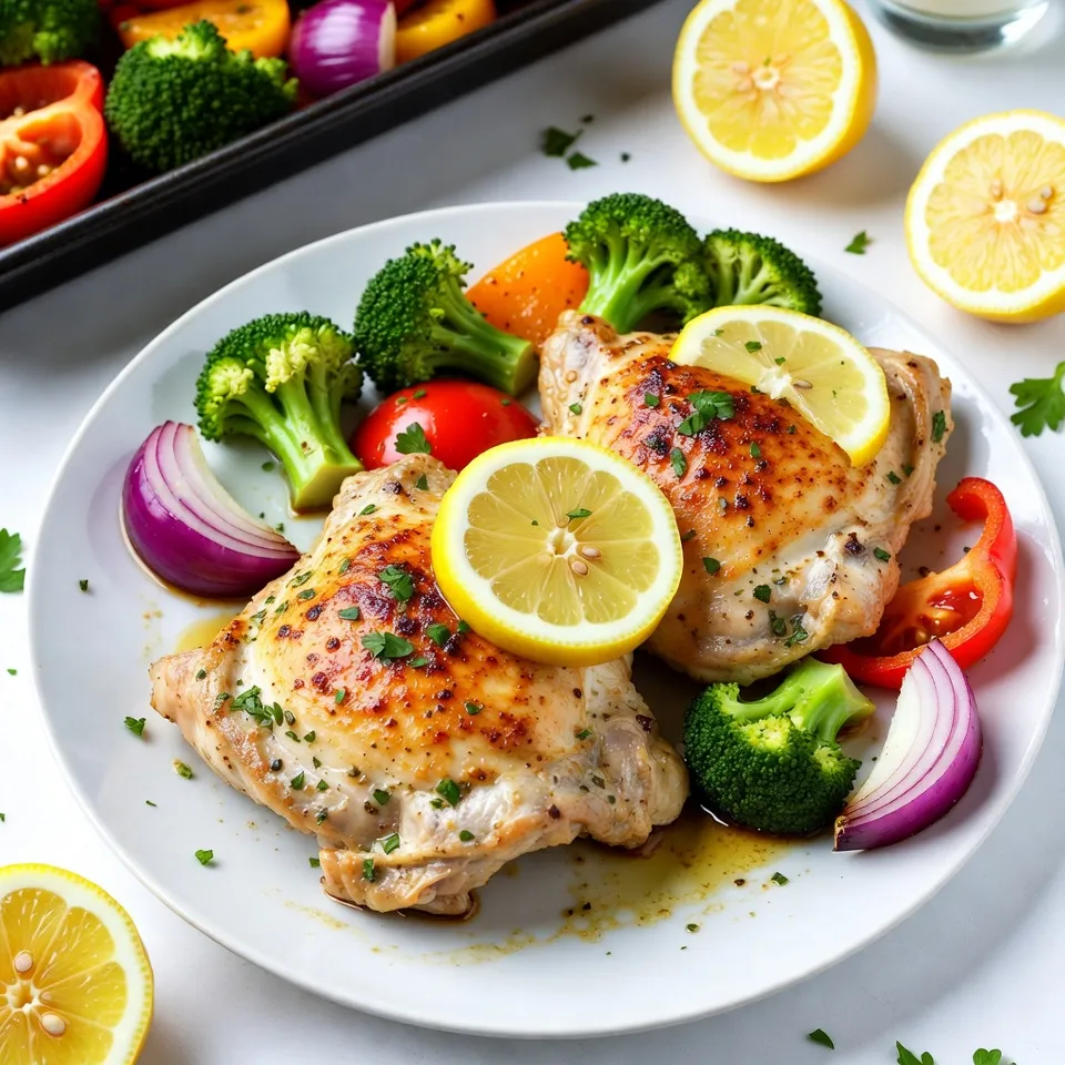 - 4 boneless, skinless chicken thighs - 2 tablespoons olive oil - 2 lemons (zested and juiced) - 3 garlic cloves, minced - 1 teaspoon dried oregano - 1 teaspoon dried thyme - Salt and pepper, to taste - 2 cups broccoli florets - 1 bell pepper, sliced (any color) - 1 red onion, cut into wedges - Fresh parsley, chopped (for garnish) To make the Sheet Pan Lemon Herb Chicken & Veggies, gather these simple ingredients. The chicken thighs are juicy and flavorful. The lemon adds a bright taste that lifts everything. Olive oil helps the chicken and veggies cook perfectly. Fresh garlic gives a rich depth to the dish. I love using fresh herbs like oregano and thyme. They add warmth and aroma. Salt and pepper are key to bring out all the flavors. The veggies, like broccoli, bell pepper, and red onion, provide color and crunch. Each ingredient plays an important role. They work together to create a meal that tastes great and looks stunning on your plate. Plus, using a single sheet pan keeps the cleanup easy! {{ingredient_image_1}} In a large bowl, combine these ingredients: - 2 tablespoons olive oil - Zest and juice from 2 lemons - 3 minced garlic cloves - 1 teaspoon dried oregano - 1 teaspoon dried thyme - Salt and pepper to taste Mix well to create a zesty marinade for the chicken thighs. The lemon adds brightness, while the herbs give depth. This mix will infuse the chicken with great flavor. Next, add the 4 boneless, skinless chicken thighs to the marinade. Make sure each piece is well-coated. I recommend letting the chicken marinate for at least 15 minutes. If you have more time, letting it sit for up to 1 hour in the fridge will enhance the flavor even more. While the chicken marinates, prepare your veggies. Toss together: - 2 cups broccoli florets - 1 sliced bell pepper (any color) - 1 red onion, cut into wedges Drizzle a bit of olive oil, and season with salt and pepper. This adds flavor and helps them roast nicely. Now, line a large sheet pan with parchment paper for easy cleanup. Place the marinated chicken on one side of the pan and arrange the veggies on the other side. Pour any remaining marinade over everything. Bake in the preheated oven at 425°F (220°C) for 25-30 minutes. The chicken should reach an internal temperature of 165°F (75°C) and the veggies should be tender. If you like a bit of char, switch the oven to broil for the last 2-3 minutes. Just keep an eye on it to avoid burning. Once cooked, let everything rest for 5 minutes. Garnish with chopped fresh parsley before serving. Enjoy your delightful dish! To make this dish shine, marinate the chicken well. I recommend marinating for at least 15 minutes. For deeper flavor, let it sit for up to an hour in the fridge. This gives the chicken a lovely taste from the lemon and herbs. When baking, set your oven to 425°F (220°C). This high heat helps the chicken get that golden-brown color. If you want juicy chicken, check the internal temp. It should reach 165°F (75°C). If it’s not done, pop it back in for a few more minutes. For a rustic feel, serve right from the sheet pan. It looks great and saves on dishes! If you want to impress, plate the chicken and veggies. Add a lemon slice on the side for color. Fresh parsley on top makes it pop. A good sheet pan is key. I like ones with a light color. This helps the food cook evenly. If you can, use a rimmed sheet pan. It catches juices and makes cleanup easy. For cooking tools, a good set of tongs helps when flipping chicken. A meat thermometer is a must. It ensures your chicken is safe to eat and perfectly cooked. Pro Tips Marinate for Maximum Flavor: Allowing the chicken to marinate for at least 1 hour enhances the flavor significantly, so consider prepping this dish ahead of time. Veggie Variations: Feel free to add other vegetables like carrots, zucchini, or asparagus for more color and nutrition. Extra Crispiness: Broiling at the end helps achieve a nice crispy texture on the chicken and caramelizes the vegetables for added flavor. Serve with Sides: This dish pairs well with rice or quinoa, making it a complete meal with grains and protein. {{image_2}} You can use chicken breasts or drumsticks in this recipe. Chicken breasts will cook faster than thighs. Drumsticks add a fun, crispy texture. For vegetarian options, consider using firm tofu or chickpeas. Both options soak up the lemon and herbs well. Adjust cooking time based on the protein you choose. Feel free to mix in seasonal vegetables. Zucchini, asparagus, or carrots work great. Each vegetable has a different cooking time. Broccoli and bell peppers take about 25-30 minutes. Carrots may need an extra 5-10 minutes. Keep an eye on them to avoid overcooking. You can add different spices or herbs to change the taste. Try paprika for a smoky flavor or rosemary for a woodsy touch. Adding sauces can also boost flavor. A splash of soy sauce or balsamic vinegar can add depth. Experiment to find your favorite combination! To keep your leftover sheet pan lemon herb chicken and veggies fresh, store them promptly. Place the cooled chicken and veggies in an airtight container. Make sure to separate them to prevent sogginess. This method keeps everything tasty for later meals. Glass or plastic containers with tight lids work best. If you have a lot, use smaller containers for easy access. You can freeze your chicken and veggies for future meals. First, let them cool completely. Then, put them in freezer-safe bags or containers. Squeeze out as much air as you can before sealing. This helps prevent freezer burn. For thawing, place the bag in the fridge overnight. Reheat in the oven or microwave until hot. Make sure the chicken reaches 165°F (75°C) for safety. Leftovers can stay in the fridge for about three to four days. After that, the quality can decrease. If you freeze them, they can last for three to four months. Always check for any signs of spoilage before eating. If it smells off or looks strange, throw it away. Enjoy your delic