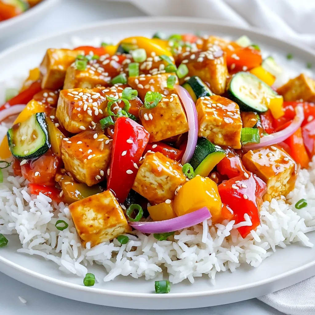 In a large bowl, mix the cubed tofu with sliced red and yellow bell peppers, zucchini, and red onion. Make sure to toss them gently. In another bowl, whisk together sweet chili sauce, soy sauce, sesame oil, minced garlic, and minced ginger. This sauce brings all the flavors together.