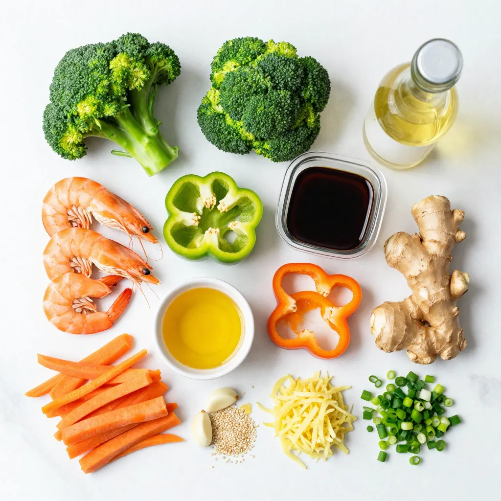 - 1 pound large shrimp, peeled and deveined - 2 cups broccoli florets - 1 bell pepper, sliced (any color) - 1 carrot, julienned - 2 tablespoons olive oil This dish shines with fresh shrimp and colorful veggies. The shrimp adds protein, while broccoli, bell pepper, and carrot bring fiber and crunch. Olive oil gives richness and helps the veggies roast well. - 1/4 cup low-sodium soy sauce - 2 tablespoons honey - 1 tablespoon rice vinegar - 1 teaspoon ginger, grated - 2 cloves garlic, minced - 1 teaspoon sesame oil The teriyaki sauce ties it all together. Low-sodium soy sauce keeps it light. Honey adds sweetness, while rice vinegar gives a tangy kick. Ginger and garlic boost the flavor. Sesame oil adds a nice finish. - 1 tablespoon sesame seeds (optional) - Green onions, chopped for garnish These garnishes elevate the dish. Sesame seeds add crunch, and green onions add freshness. When selecting vegetables, look for bright colors and firm textures. Fresh veggies taste better and add nutrients. {{ingredient_image_1}} 1. First, preheat your oven to 400Β°F (200Β°C). This helps cook the dish evenly. 2. Next, line a large baking sheet with parchment paper. This makes cleanup easy. 3. In a medium bowl, whisk together the following ingredients: - 1/4 cup low-sodium soy sauce - 2 tablespoons honey - 1 tablespoon rice vinegar - 1 teaspoon grated ginger - 2 cloves minced garlic - 1 teaspoon sesame oil 4. Make sure to reserve 2 tablespoons of this marinade. You will drizzle it later. 1. In a large mixing bowl, combine: - 1 pound peeled and deveined shrimp - 2 cups broccoli florets - 1 sliced bell pepper - 1 julienned carrot 2. Pour the marinade over the shrimp and veggies. Toss well to coat everything. 3. Spread the mixture in a single layer on the prepared baking sheet. 4. Bake in the oven for 12-15 minutes. The shrimp should be pink and cooked through. The veggies should be tender but still crisp. 1. Once done, remove the sheet from the oven. Drizzle the reserved marinade over the top. 2. Sprinkle with sesame seeds and chopped green onions for a fresh touch. 3. Serve immediately. You can enjoy this dish with rice or on its own for a lighter meal. - To know when shrimp are cooked, look for a pink color and firm texture. - Cook shrimp for 12-15 minutes at 400Β°F (200Β°C) for the best results. - For crisp veggies, avoid overcooking. They should be tender yet still crunchy. - To save time, prep all ingredients before you start cooking. - Use parchment paper on your baking sheet for easy cleanup. It helps food slide off easily. - Serve directly from the sheet pan for a casual look or on a bright platter for a special touch. - Add color with fresh green onions and sesame seeds to enhance appeal. Pro Tips Fresh Ingredients: Use fresh, high-quality shrimp and vegetables for the best flavor and texture in your dish. Marinade Time: For even more flavor, allow the shrimp and veggies to marinate for 15-30 minutes before cooking. Even Cooking: Arrange the shrimp and vegetables in a single layer on the baking sheet to ensure even cooking and browning. Serving Suggestions: Serve with steamed rice or quinoa for a complete meal, and garnish with lime wedges for an extra zing! {{image_2}} You can change the veggies based on the season. In spring, use snap peas and asparagus. In summer, try zucchini and cherry tomatoes. Fall brings great choices like Brussels sprouts and butternut squash. Winter is perfect for root veggies like sweet potatoes and parsnips. Cooking times may change with different veggies. Soft vegetables like zucchini need less time, about 10 minutes. Harder ones like carrots may take longer, around 15 minutes. If you want a twist, use chicken or tofu. Chicken breast works well; cut it into bite-sized pieces. For beef, flank steak is tasty too. Tofu is great for a plant-based option; use firm tofu for the best texture. Adjust the marinade to fit these proteins. Chicken and beef can handle a bit more seasoning. For tofu, marinate it longer to soak up flavors. You can easily boost flavors by adding spices. Try red pepper flakes for heat or garlic powder for more garlic. Adding sauces like sriracha can create a spicy kick. For a tangy note, switch to apple cider vinegar or balsamic vinegar. Each type brings a new taste to your dish. Experimenting with these flavors can make your meal unique every time. To store leftovers, let the dish cool completely. Place the shrimp and veggies in an airtight container. Store the container in the refrigerator. Ideally, eat leftovers within three days for the best taste. If you want to freeze the dish, use freezer-safe bags. Squeeze out the air before sealing. This helps prevent freezer burn. When you are ready to eat, thaw overnight in the fridge. When stored in the fridge, this dish lasts about three days. In the freezer, it can last up to three months. Always check for signs of spoilage. If the shrimp smells off or the veggies look slimy, it's time to toss them out. Freshness is key for the best flavor and safety. The best way to reheat shrimp and veggies is in the oven. Preheat to 350Β°F (175Β°C). Spread the dish on a baking sheet and heat for about 10 minutes. You can also use a microwave. Heat in short bursts of 30 seconds, stirring in between. This helps keep the shrimp juicy and the veggies crisp. For added flavor, drizzle a little soy sauce before reheating. Yes, you can make this dish ahead. Prepare the shrimp and veggies with the marinade. Store them in the fridge for up to 24 hours. This step saves time on busy days. When ready to cook, spread the mixture on a sheet pan and bake as directed. This dish pairs well with several sides. Here are some options: - Steamed rice or jasmine rice - Quinoa for a healthy choice - A fresh green salad - Miso soup for a comforting touch - A light, fruity beverage like iced tea Yes, you can make this dish gluten-free. Use gluten-free soy sauce instead of regular soy sauce. Check the label to ensure it meets your nee