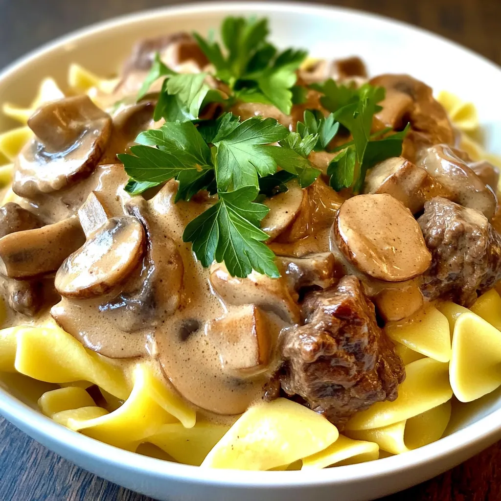 Finally, serve the beef stroganoff over the egg noodles. For a nice touch, garnish with freshly chopped parsley. This step adds a pop of color and freshness to your plate!