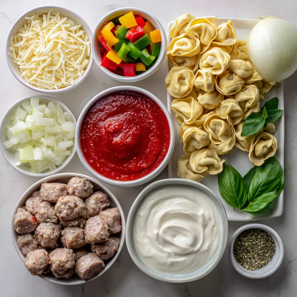 These ingredients combine to create a rich and creamy dish. The sausage adds a savory flavor, while the cheese tortellini brings a delightful texture. Marinara sauce gives the dish a nice, tangy base. Fresh basil leaves make a perfect garnish, adding a pop of color and freshness.
