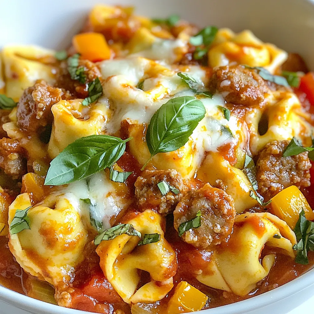 In this recipe, we need some tasty ingredients. Here’s what you’ll use: - 1 pound Italian chicken sausage, removed from casing - 1 onion, diced - 3 cloves garlic, minced - 1 bell pepper, diced (any color) - 2 cups marinara sauce - 1 cup vegetable broth - 12 ounces fresh cheese tortellini - 1 cup heavy cream - 1 teaspoon dried oregano - 1 teaspoon dried basil - Salt and pepper to taste - 1 cup shredded mozzarella cheese - Fresh basil leaves for garnish These ingredients combine to create a rich and creamy dish. The sausage adds a savory flavor, while the cheese tortellini brings a delightful texture. Marinara sauce gives the dish a nice, tangy base. Fresh basil leaves make a perfect garnish, adding a pop of color and freshness. Make sure to gather everything before you start cooking. This way, you’ll have an easier time preparing this delicious meal. Enjoy the cooking process! {{ingredient_image_1}} First, heat a skillet over medium heat. Add the Italian chicken sausage to the pan. Cook for about 5 to 7 minutes. Use a spoon to break the sausage into small pieces. Once browned, drain any excess fat. This helps keep the dish lighter. Next, transfer the cooked sausage to the slow cooker. Add the diced onion, minced garlic, and diced bell pepper. These veggies add flavor and color. Pour in the marinara sauce and vegetable broth. Stir in the dried oregano and basil for extra taste. Season with salt and pepper to your liking. Cover the slow cooker and set it on low for 4 hours. If you're short on time, use the high setting for 2 hours. After the cooking time, add the fresh cheese tortellini and heavy cream. Stir gently to mix. Cover again and cook for an additional 30 minutes on low or 15 minutes on high. When the tortellini is tender, stir in the shredded mozzarella cheese until it melts and becomes creamy. To make this dish even better, adjust the seasonings. You can add more oregano and basil for a stronger taste. If you love spice, try a pinch of red pepper flakes. For a richer flavor, use chicken broth instead of vegetable broth. To enhance creaminess, add the heavy cream slowly. Stir it well into the sauce. This helps it mix evenly. You can also use a whisk to blend it smoothly. If the sauce seems too thick, add more broth or cream until you reach your desired texture. For a beautiful presentation, serve the tortellini in large bowls. Top each bowl with fresh basil leaves and a sprinkle of mozzarella cheese. This adds color and makes it look fancy. For sides, garlic bread pairs perfectly. It soaks up the sauce nicely. A simple green salad adds freshness to the meal. You can also serve it with a light vinaigrette for extra zest. Pro Tips Use Fresh Ingredients: Fresh vegetables and herbs can elevate the flavor of your dish significantly. Opt for fresh basil and seasonal bell peppers for a vibrant taste. Customize Your Sausage: Experiment with different types of sausage such as spicy Italian or turkey sausage for a unique twist on the classic flavor. Adjust Creaminess: If you prefer a lighter version, you can substitute half-and-half or a non-dairy cream alternative instead of heavy cream. Perfect Tortellini Cooking: To avoid overcooking, add the tortellini during the last 30 minutes of cooking and check for doneness frequently. {{image_2}} You can switch up the sausage for more flavor. Try spicy Italian sausage or turkey sausage for a lighter option. Both give a nice twist to the dish. You can also use plant-based sausage if you want a vegetarian meal. For veggies, consider adding spinach or zucchini. Both cook well in the slow cooker and boost nutrition. You can also toss in mushrooms for a hearty texture. If you need gluten-free options, look for gluten-free tortellini. Many brands offer this choice now, so it's easier than ever. Just check the package to be sure. For lower-calorie versions, use less heavy cream. You can swap in low-fat milk to keep it creamy. You can also reduce the amount of cheese or use a lighter cheese. This keeps the taste without too many calories. After you enjoy your Slow Cooker Cheese Tortellini and Sausage, you may have some leftovers. Let the dish cool down to room temperature first. This helps to keep the flavors fresh. Once cooled, transfer the leftovers to airtight containers. Glass or plastic containers work well. Make sure to seal them tightly to prevent air from getting in. Label the containers with the date. This way, you remember when you stored them. To reheat the dish, the best method is using the stove or microwave. On the stove, heat it in a pot over low heat. Stir often to warm it evenly. If you use a microwave, heat it in short bursts. Stir between each burst to avoid hot spots. Enjoy the meal within three to four days for the best taste. If stored correctly, it can last up to a week. Yes, you can use frozen tortellini. Just add it to the slow cooker for the last 30 minutes of cooking. It will cook perfectly and still taste great. To make this dish vegetarian, swap the sausage for a plant-based option. You can also use mushrooms or zucchini for added flavor and texture. You can use half-and-half, whole milk, or a plant-based cream. These options will give you a creamy texture without the heaviness. Yes, you can! Start by browning the sausage in a pot, then add the veggies and sauces. Let it simmer for about 30 minutes. Stir in the tortellini and cream last. The tortellini is done when it is tender and floats to the top of the sauce. This usually takes about 30 minutes on low heat. This recipe uses simple ingredients like chicken sausage, fresh tortellini, and marinara sauce. I shared easy steps for cooking in a slow cooker. I also highlighted tips for flavor and possible swaps for different diets. In the end, making this dish is fun and rewarding. With little effort, you can create a tasty meal everyone will enjoy. Enjoy your cooking journey!