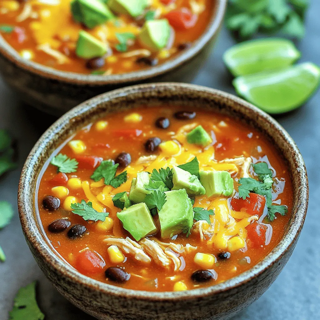 Onions and garlic give a flavorful base. Chicken broth enhances the soup’s richness. Taco seasoning and cumin are key for that authentic taste. Don’t forget salt and pepper to make it pop. Cheese brings creaminess, while cilantro, avocado, and lime wedges make the dish bright and fresh.