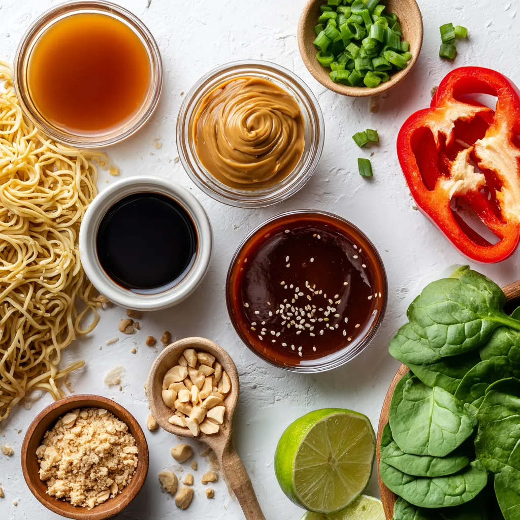 In this dish, we start with ramen noodles. They provide a great base. Their chewy texture pairs well with the sauce. Next, creamy peanut butter adds richness. It gives the sauce a nice, smooth feel. Vegetable broth brings flavor and moisture.