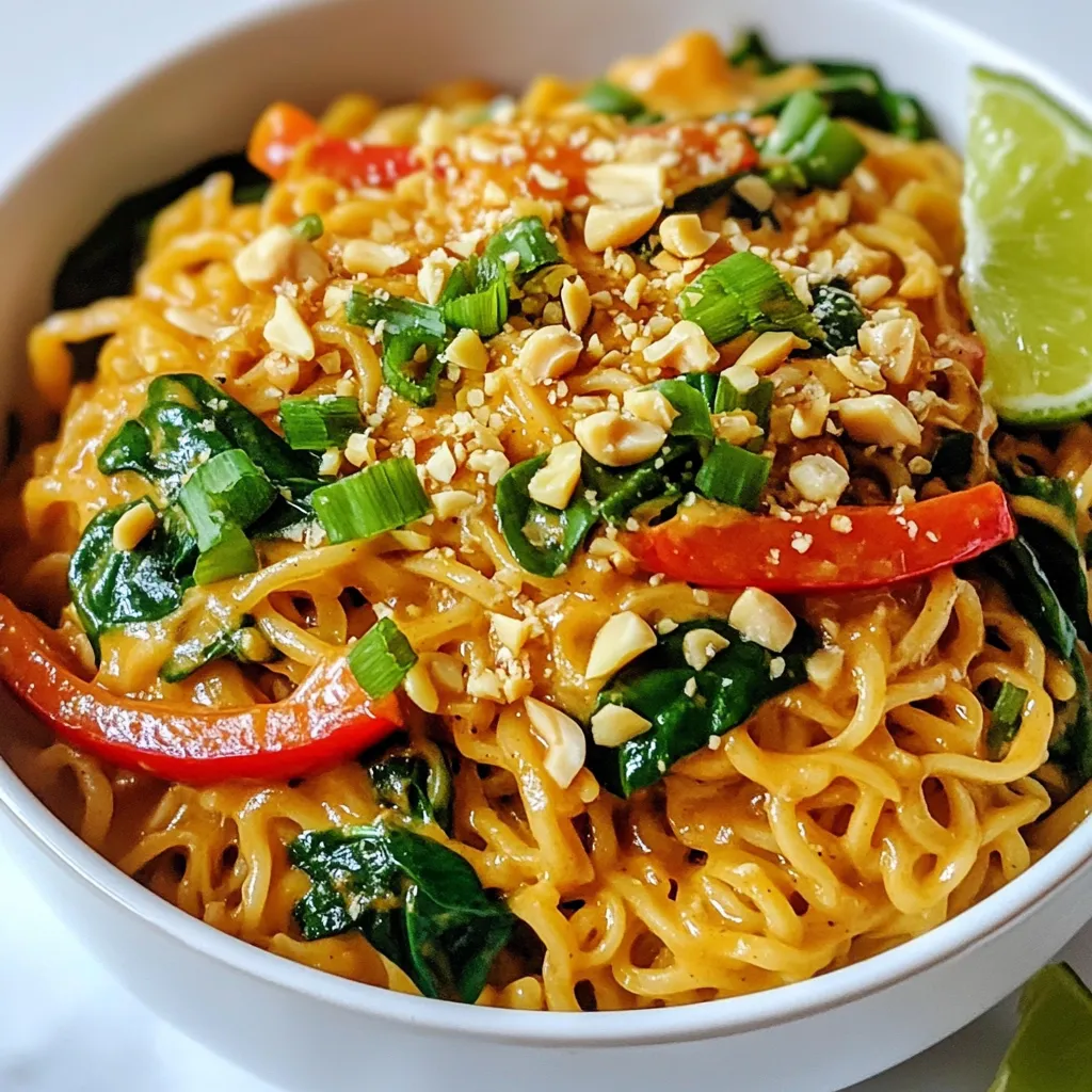 For the vegetables, red bell pepper adds sweetness and color. Baby spinach wilts down nicely, bringing nutrients. Garnishes like green onion and crushed peanuts add crunch. Lime wedges add a fresh zing. They balance the creamy sauce with acidity.