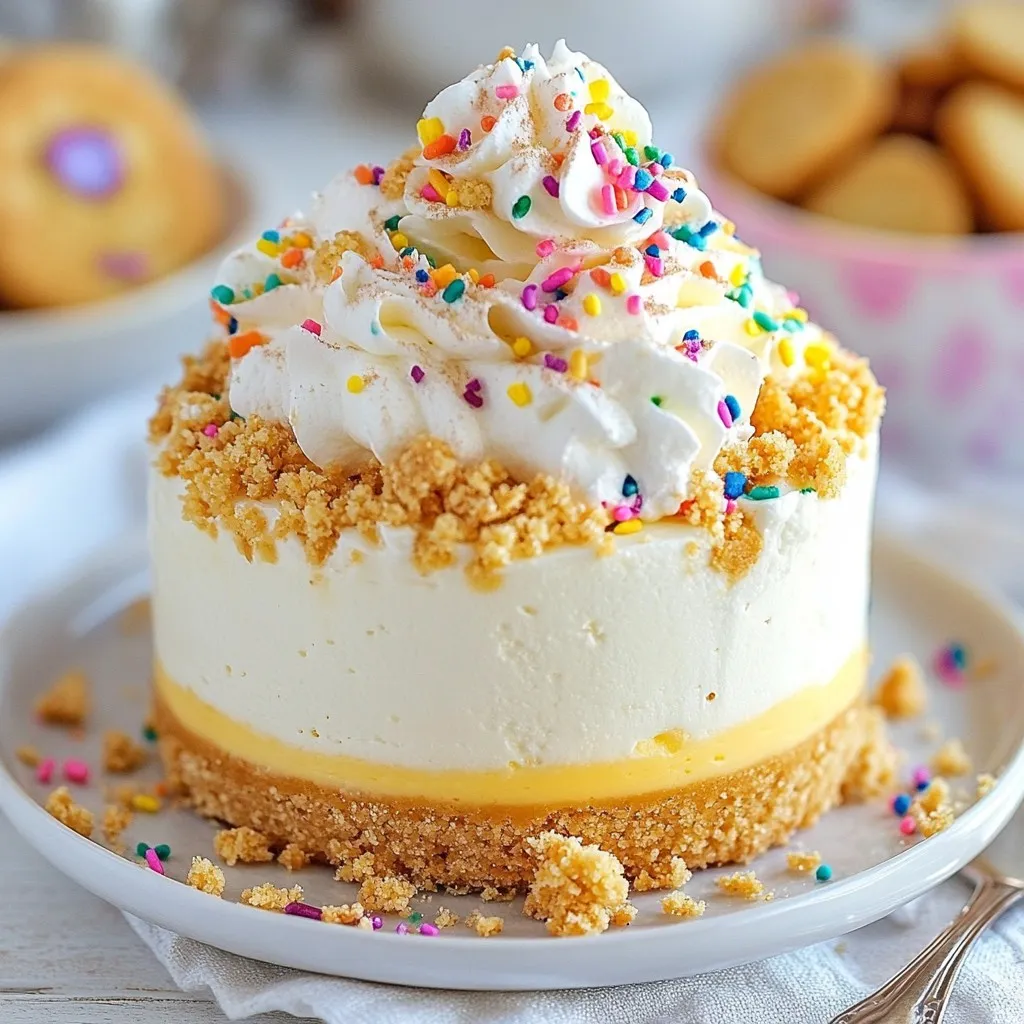 When it’s time to serve, remove the cheesecake from the springform pan. Top it with whipped cream for a fluffy touch. You can also add cookie sprinkles or crumbled sugar cookies for fun. This adds color and a nice crunch. Enjoy your cheesecake with a cup of coffee or tea for a perfect treat!