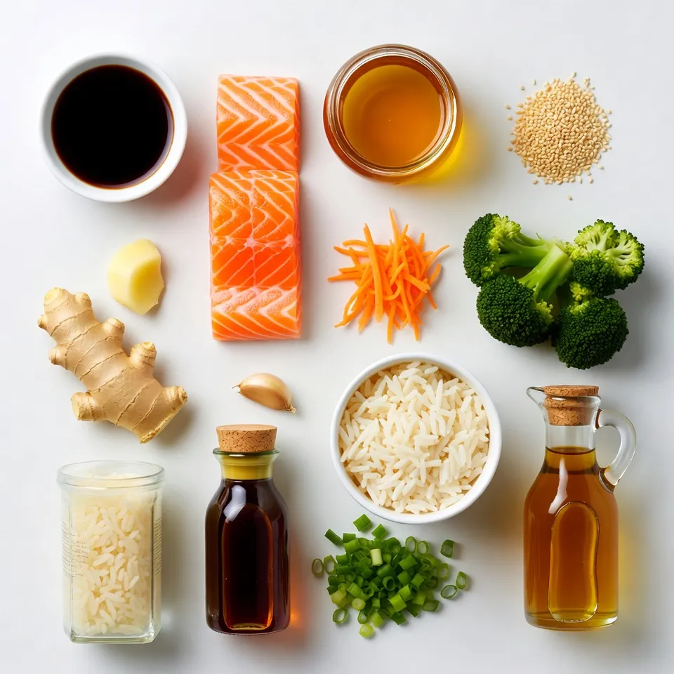 Gather these fresh ingredients for your teriyaki salmon bowls. The salmon fillets provide protein and a rich flavor. Low-sodium soy sauce adds a savory note without too much salt. Honey brings sweetness, balancing the flavors. Rice vinegar gives it a nice tang. Fresh ginger and garlic add depth and aroma. Sesame oil enhances the dish with nutty notes.