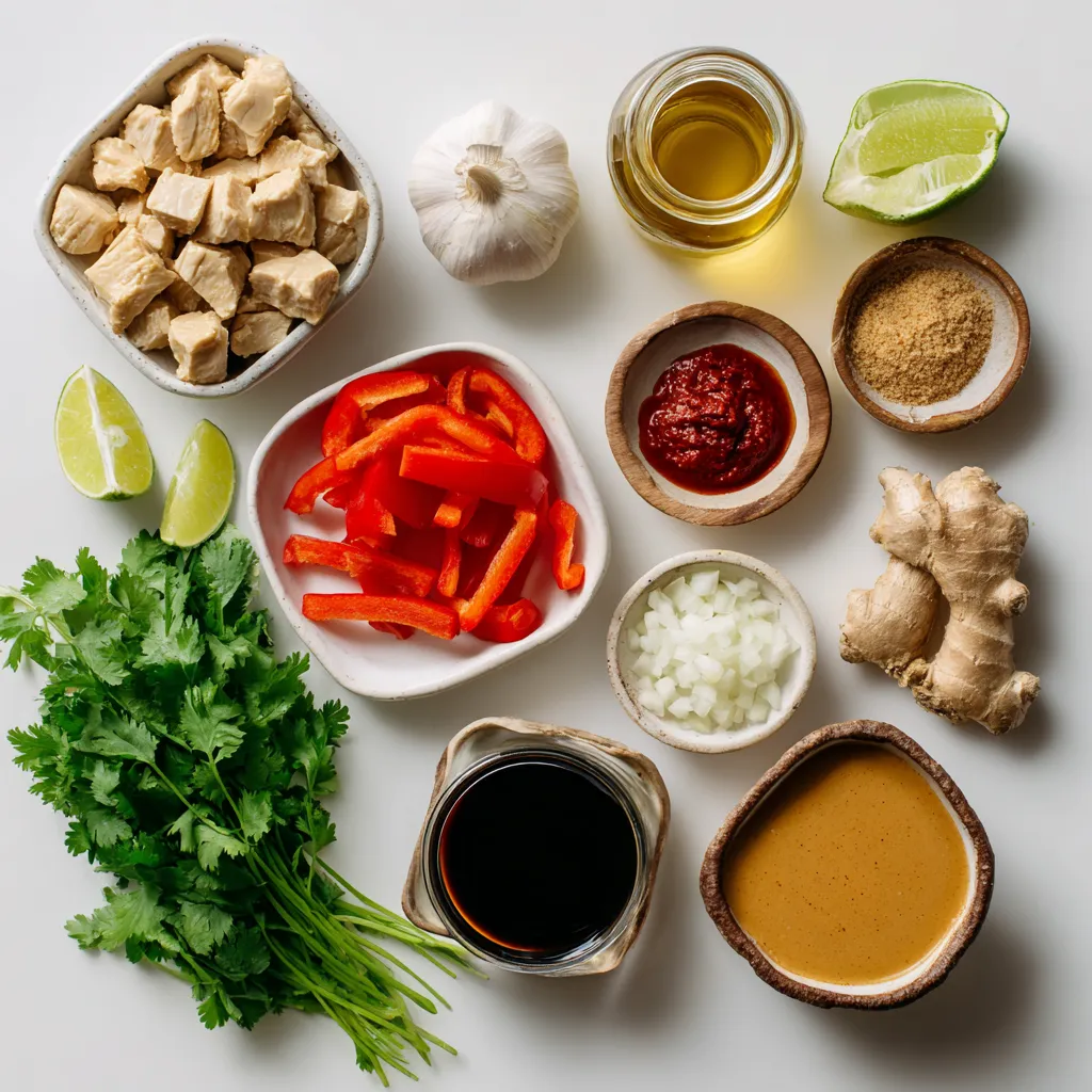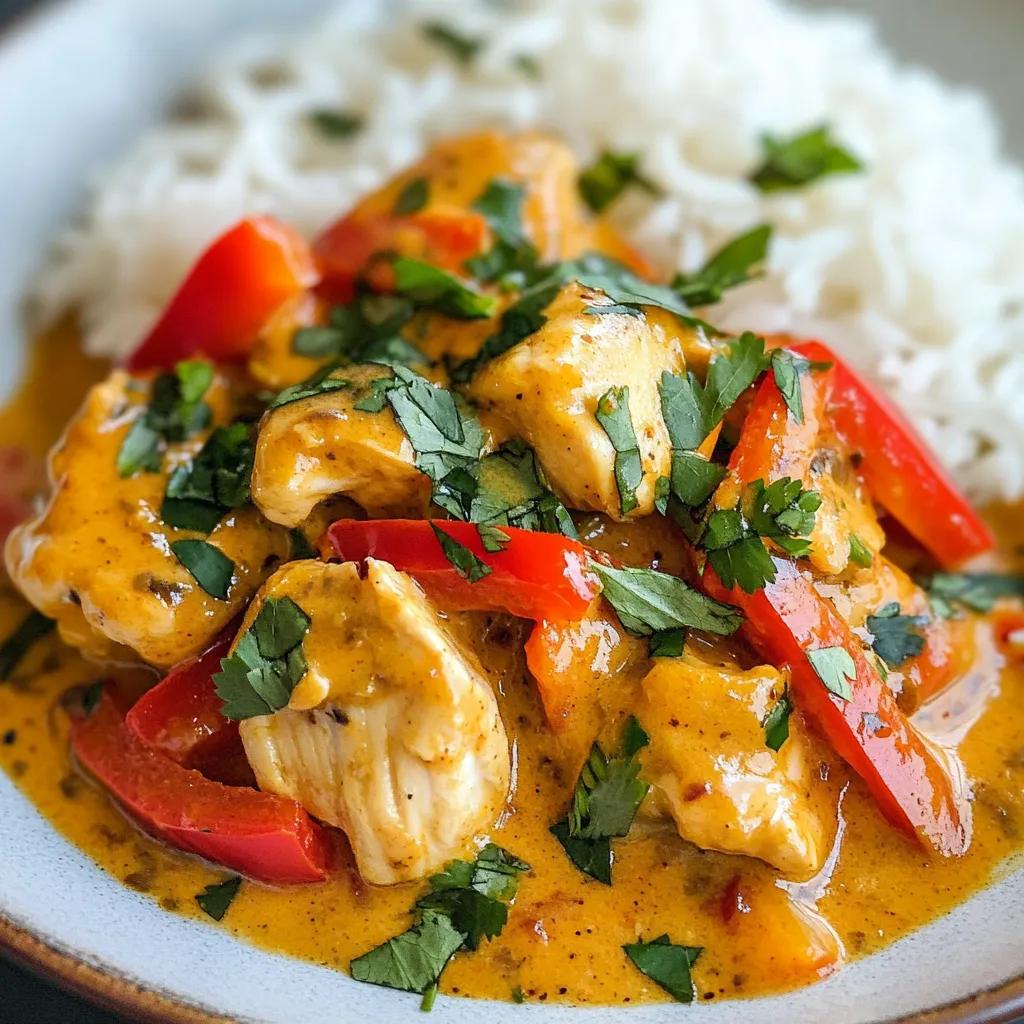 To make Thai Peanut Curry Chicken, gather these items: - 1 1/2 lbs boneless, skinless chicken thighs, cut into bite-sized pieces - 1 tablespoon coconut oil - 1 medium onion, finely chopped - 3 cloves garlic, minced - 1 tablespoon fresh ginger, minced - 1 red bell pepper, sliced - 1 cup coconut milk - 1/2 cup creamy peanut butter - 3 tablespoons red curry paste - 2 tablespoons soy sauce - 1 tablespoon brown sugar - Zest and juice of 1 lime For a fresh touch, try these garnishes: - Fresh cilantro, chopped - Lime wedges - Crushed peanuts - Sliced green onions These add color and flavor to your dish. Serve your curry with these sides: - Cooked jasmine rice - Steamed broccoli - Cucumber salad - Thai spring rolls These pair well and make your meal complete. Enjoy the balance of flavors! {{ingredient_image_1}} Start by getting your ingredients ready. You will need chicken, onion, garlic, ginger, and more. Heat coconut oil in a large skillet over medium-high heat. Add the chopped onion and cook until soft. This takes about 3 to 4 minutes. Then, toss in the minced garlic and ginger for one more minute. Next, raise the heat and add the chicken pieces. Cook them until they are browned and fully done, which should take about 5 to 7 minutes. Add the sliced red bell pepper and cook for another 2 to 3 minutes. This will make the pepper tender but still crisp. In a separate bowl, mix coconut milk, peanut butter, red curry paste, soy sauce, and brown sugar. Whisk this until it's smooth. Once your chicken and vegetables are cooked, pour this mixture over them. Stir well and let it simmer for 5 to 6 minutes. This allows the sauce to thicken up a bit. Finally, add lime zest and juice to brighten the flavors. Taste and adjust the seasoning if needed. Remove it from the heat and garnish with fresh cilantro. Serve this hot over jasmine rice for a delightful meal. Sautéing is the main technique here. This method helps to build flavor. Sauté the onion until it's soft, then add garlic and ginger. This will give your dish a great base flavor. Browning the chicken is also key. It locks in juices and adds depth. When you add the red bell pepper, it adds both color and crunch. Simmering the sauce at the end is important. This allows all the flavors to meld together. The goal is to achieve a creamy, rich sauce that coats the chicken beautifully. Keep an eye on your skillet's heat. Medium-high heat works best for sautéing. If it's too low, your chicken won't brown. If it's too high, it may burn. When simmering the sauce, use medium heat. This prevents burning and helps the sauce thicken evenly. Prep your ingredients ahead of time. This will save you from rushing. Have everything chopped and measured before you start cooking. This way, you can focus on enjoying the process. To make your Thai peanut curry chicken extra creamy, use full-fat coconut milk. It gives a rich texture. You can also add more peanut butter. This boosts the creaminess and flavor. Stir in the peanut butter slowly to blend it well. It helps create a smooth sauce that coats the chicken perfectly. If you want more heat, add a pinch of chili flakes. You can also use a bit of sriracha sauce. Start with a small amount, taste, and adjust as needed. If the dish is too spicy, add more coconut milk. This can help balance the heat and keep the dish enjoyable. To enhance the flavors, try adding lime zest and juice at the end. It brightens the dish and adds freshness. You can also toss in some chopped peanuts for crunch. Fresh herbs, like basil or mint, can add a new layer of flavor. Experiment with these ideas to find your perfect taste! Pro Tips Use Fresh Ingredients: Fresh garlic, ginger, and cilantro will elevate the flavor of your curry. Avoid dried herbs for the best taste. Adjust Spice Level: If you prefer more heat, add extra red curry paste or a splash of sriracha. For a milder dish, reduce the amount of curry paste. Let it Simmer: Allow the curry to simmer longer for deeper flavors. Just be careful not to overcook the chicken, keeping it tender and juicy. Perfect Rice: Cook your jasmine rice with a bit of coconut milk for added flavor. This complements the curry beautifully. {{image_2}} You can swap chicken for other proteins. Shrimp is a great choice. It cooks quickly and adds a nice flavor. Firm tofu works well for a vegetarian option. Just cut it into cubes. You can also use beef, but cook it longer. For a lighter dish, try using turkey. Each protein gives its own taste. Feel free to add more veggies to your curry. Broccoli adds crunch and color. Carrots can bring a touch of sweetness. Snap peas or green beans add a nice snap. For a leafy touch, toss in some spinach at the end. You can mix and match to fit your taste. Red curry paste is common, but you can try green or yellow curry paste too. Green curry has a fresh taste and a bit more heat. Yellow curry is milder and sweet. Each paste changes the dish's flavor profile. Experiment to find your favorite! To store your Thai Peanut Curry Chicken, let it cool first. Place it in an airtight container. This helps keep the flavors fresh. You can store it in the fridge for up to three days. If you want to keep it longer, try freezing it. When you're ready to eat the leftovers, reheat them gently. You can use a microwave or a skillet. If using a microwave, heat on medium power for a few minutes. Stir halfway to warm evenly. If using a skillet, add a splash of water or broth. Heat on low until warmed through. This keeps the dish moist and tasty. For freezing, pack the curry in airtight containers. Use freezer-safe bags if you prefer. Make sure to remove as much air as possible. Label the bags with the date. You can freeze the curry for up to three months. When ready to enjoy, thaw it in the fridge overnight. Then, reheat it as described above. Enjoy your delicious Thai Peanut Curry Chicken anytime! You can serve Thai peanut curry chicken with fluffy jasmine rice. The rice soaks up the sauce well. You migh