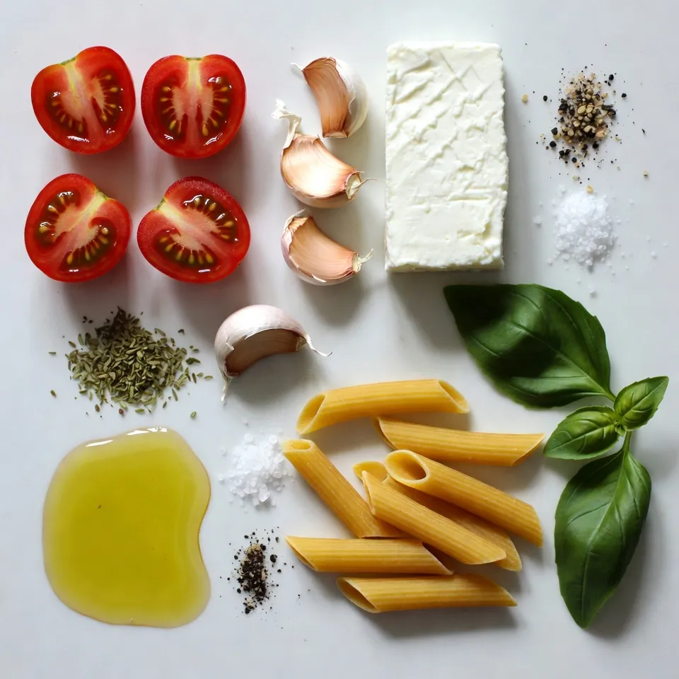For this TikTok feta pasta, you will need some simple yet fresh ingredients. The main stars are cherry tomatoes, feta cheese, garlic, and pasta. You can pick any pasta you love, like penne, fusilli, or spaghetti.