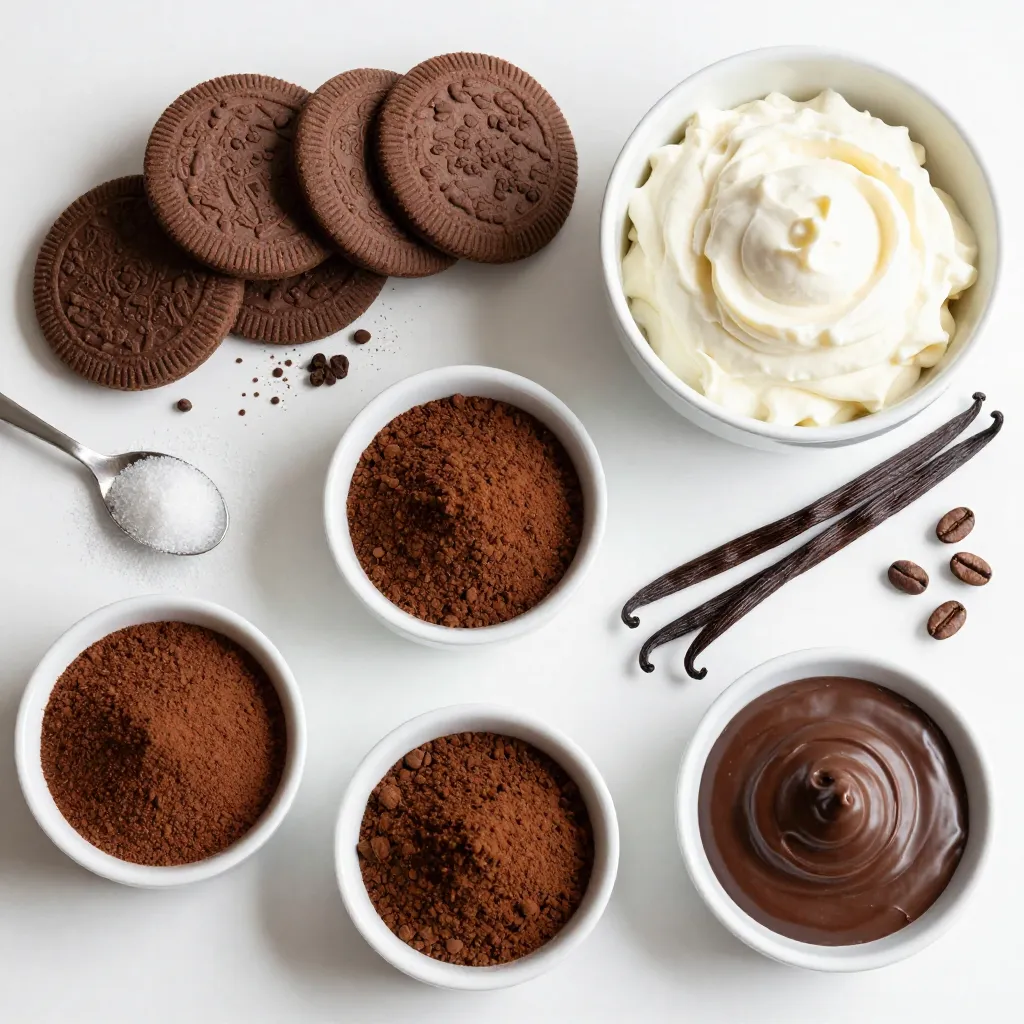 You will also need chocolate wafer cookies. Crush them well; they add a nice crunch. Coffee powder is essential for that classic tiramisu flavor. Granulated sugar sweetens the mix, while vanilla extract adds warmth.