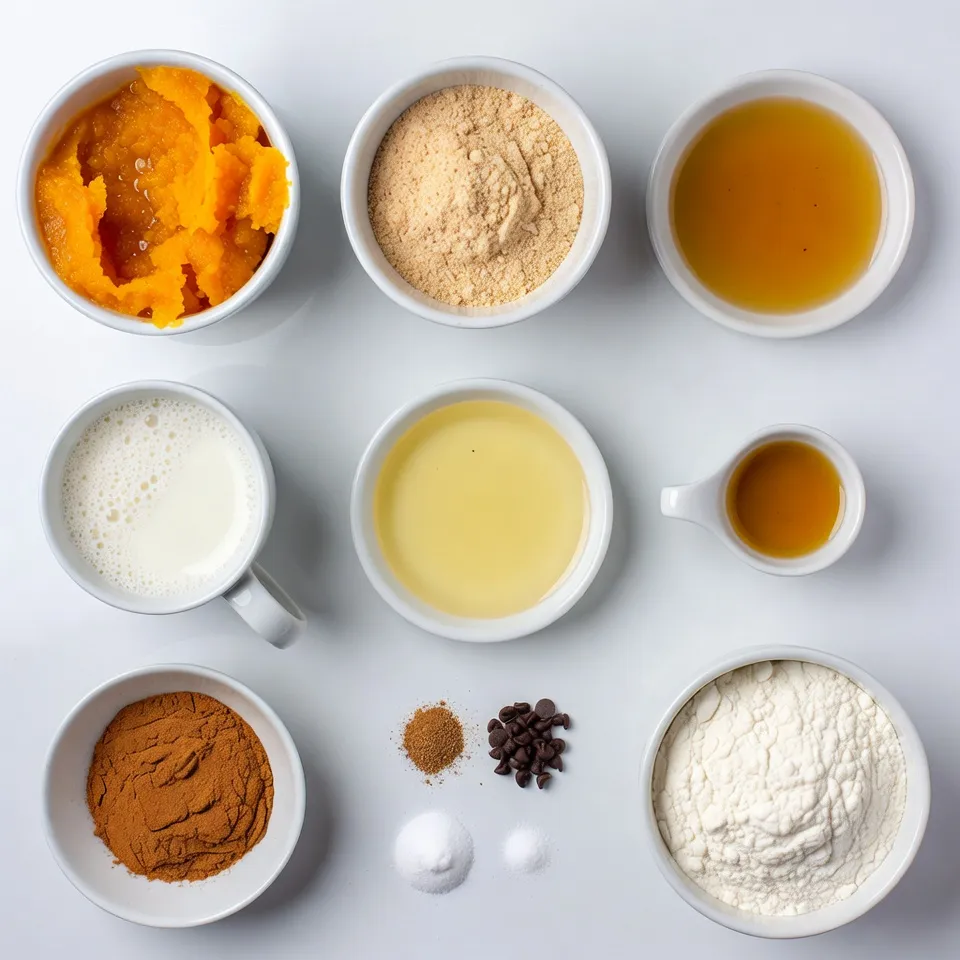 To start, gather your ingredients. You need pumpkin puree, coconut sugar, and maple syrup. Also, grab almond milk and melted coconut oil. Don’t forget vanilla extract, flour, baking soda, and baking powder. Add pumpkin pie spice, cinnamon, nutmeg, and a pinch of salt for flavor. If you want, include dairy-free chocolate chips for a tasty surprise.